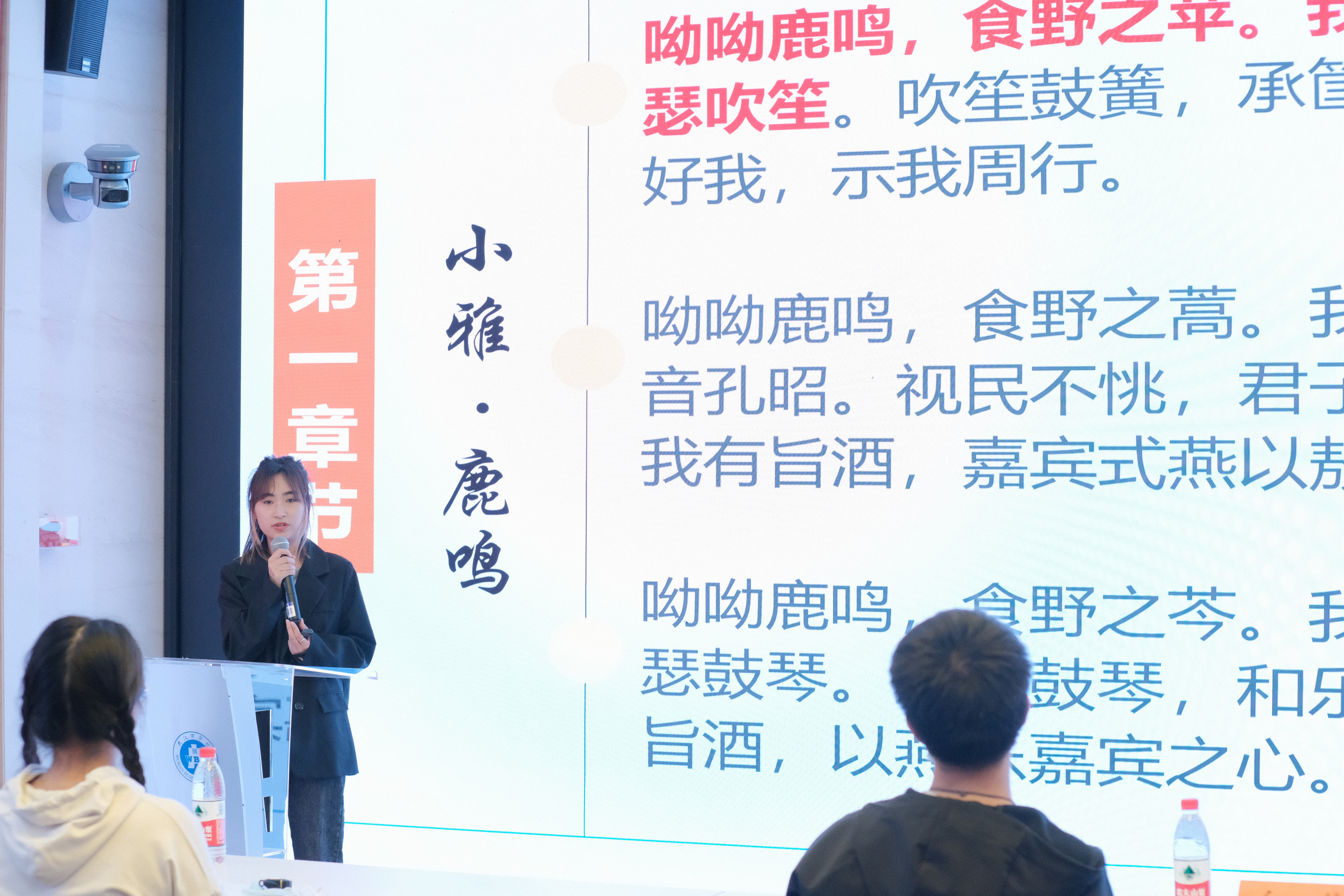 “桃之夭夭,灼灼其华;之子于归,宣其室家。”2021级旅游管理与服务教育一班的张雨洁从“美在情感”与“美在意境”两个部分进行分享,她认为读《诗经》足以让人返朴归真:“从《诗经》的诗意表达中我们能触摸到农耕文明最古老的故事,那些古人曾经经历的欢喜和忧伤似乎在我们当代人的身上也依然流淌而过,让人深受感动和启发。”“呦呦鹿鸣,食野之苹。我有嘉宾,鼓瑟吹笙。”2021级现代物业管理一班的庞芯怡从此句入手,将《诗经》中的《鹿鸣》与曹操的《短歌行》进行对比赏析,以点带面,相得益彰。“什么是‘颂’,它具有什么样的重要地位?”2021级现代物业管理一班的高琪从‘颂’本身的含义出发,结合具体篇目娓娓道来。