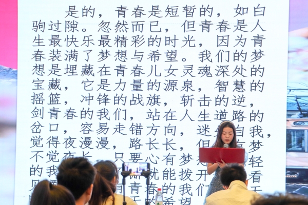 活动伊始,王梓俊朗诵的诗文《我喜欢出发》,激情澎湃,点燃了全场氛围,获得现场观众一致好评。随后,选手付恒所带来由原创诗文《青春有梦》“……愿君与我共执笔,尽洒汗墨山河里。”豪迈的笔墨书文,通过跌宕起伏,抑扬顿挫的朗诵,将青春之梦的强大力量展现在了观众眼前,引起强烈共鸣。选手黄琼芳、郭子怡的朗诵《家书中的百年》也深深吸引着观众。通过朗诵着革命烈士赵一曼的书信,她们将一位关爱子女的母亲形象,以及坚守国家的革命烈士形象映入眼帘。跨越百年的对话,看着时代的风云变迁,朗诵所展现的沉重的情感紧紧抓牢了现场老师、员工的心。