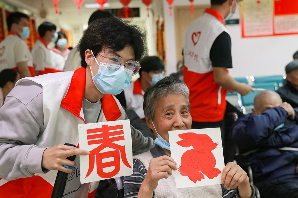 “我就是属兔的!”收到兔形剪纸的李奶奶笑得合不拢嘴,她将剪纸小心翼翼地抱在怀里,颤抖的手不停抚摸着,这是汉沙养老院发生的感人一幕。在养老院活动室里,身穿红色马甲的志愿者们围在老人们身边,同他们亲密地交谈着。