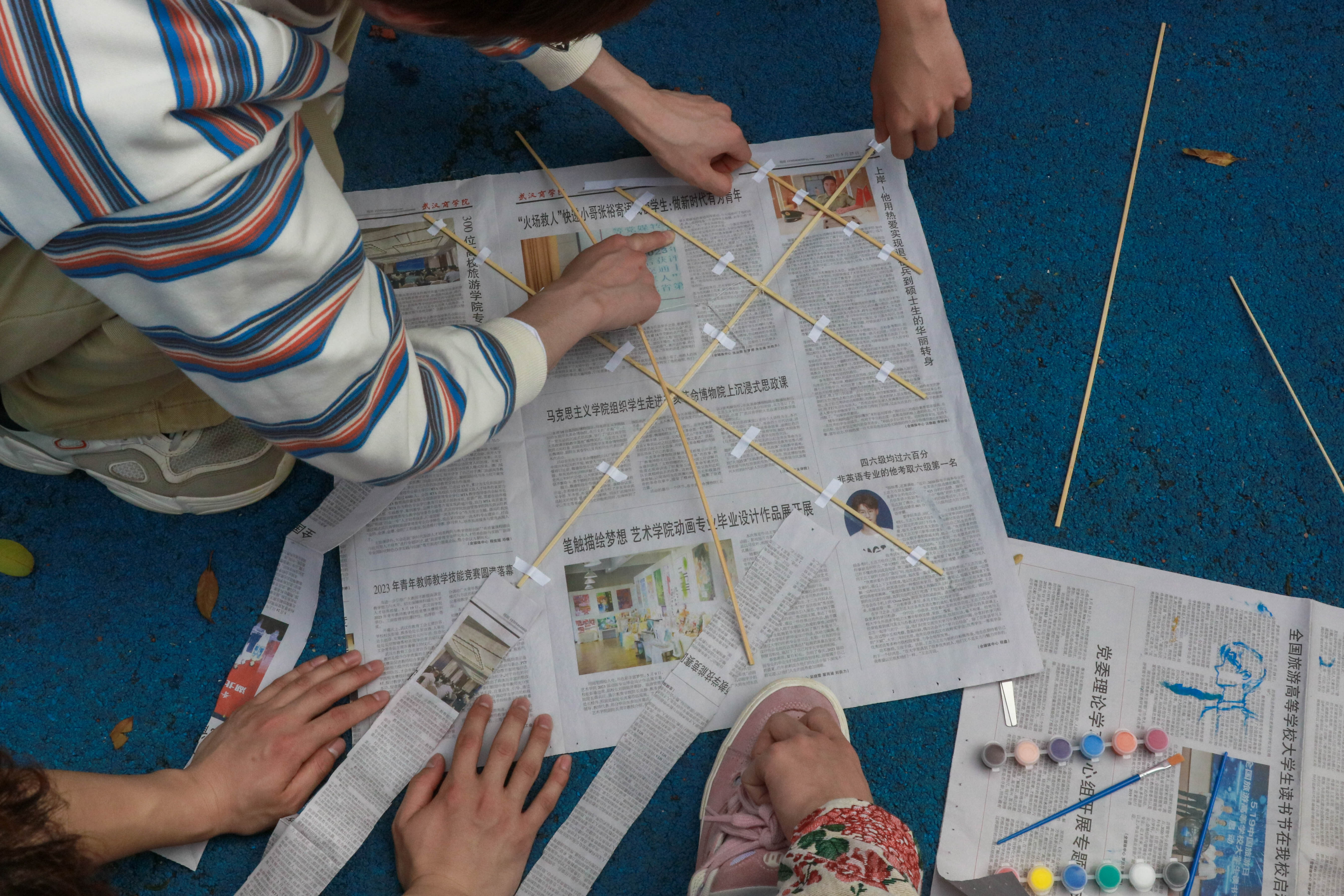 本次活动可以用旧报纸制作风筝或亲手彩绘风筝。制作风筝首先要考虑的是风筝骨架的扎制,同学们先用木条搭好骨架,再把旧报纸裁剪至合适的形状后粘贴在搭好的骨架上,最后系上线和弓弦,一个牢固的风筝便初见雏形。“排布骨架时要注意给风筝留出泄风的风兜,有利于风筝稳定放飞。”2023级bevictor1946韦德官网建筑环境与能源应用工程专业何一鸣分享说。动作创意彩绘风筝DIY是在原有的风筝艺术上创新,让风筝重新焕发生机,同学们充分发挥想象力与创造力,一笔一划将心中的色彩与想象跃然风筝之上。色彩斑斓的风筝搭配流畅的线条,不一会儿,同学们便做出了属于自己的风筝。随着一只只风筝的完工,大家都迫不及待来到草地里,三三两两相互合作,兴致勃勃地把手中的风筝放飞蓝天。同学们手握轴线,一路小跑,时而拉线放线,时而前后轻抖,精确控制着风筝升空的速度和放飞的高度。