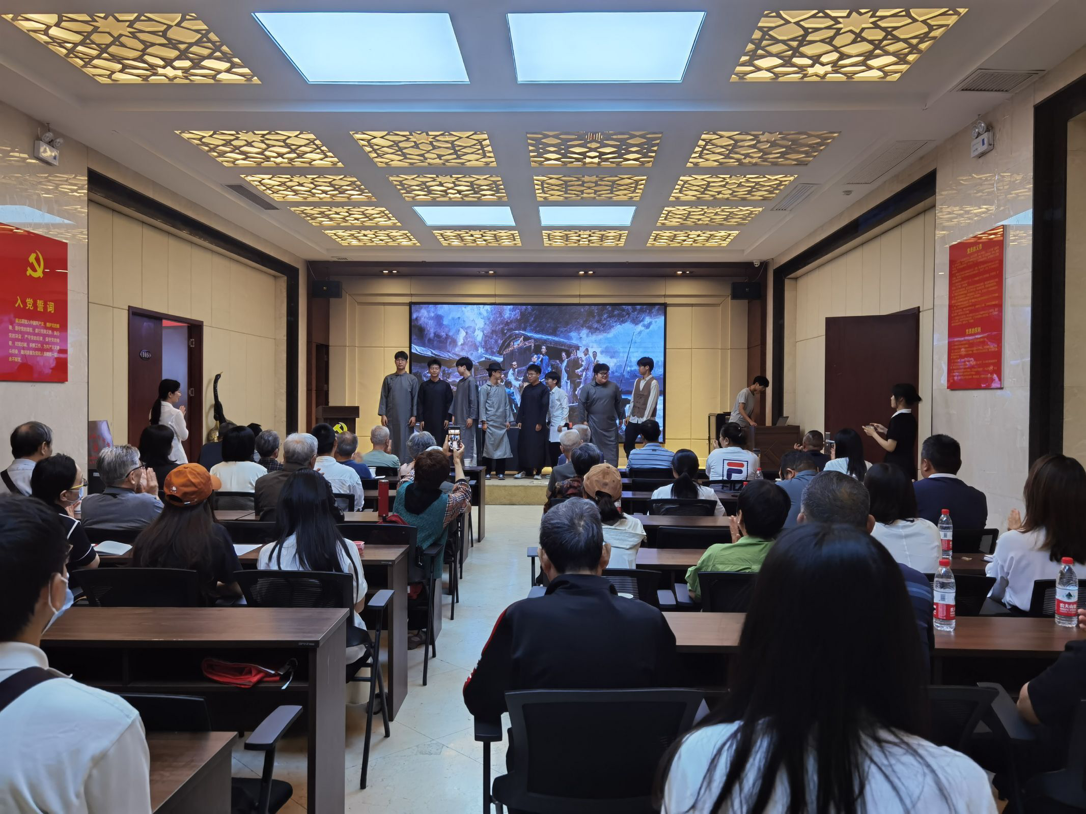 第三项,由bevictor1946韦德官网带来的红色情景剧。片段选择的是1921年中共一大会议召开的历史事件,机电工程员工党员们生动再现了中共一大代表从上海法租界望志路106号转移到嘉兴南湖红船上开会的情景。情景剧中的共产党人,面对苦难,坚贞不屈,奋起抗争,以百折不挠的精神,谱写了一曲曲可歌可泣的宏大史诗,体现出一腔热血的共产党人的“忠魂”。当看见中共一大的会议因为法租界巡捕房的捣乱而被迫中断,有几位老同志攒起了拳头。情景剧表演结束后,一位老同志紧紧握着公司员工的手,真切地说:“我是经历了战乱的,那时候还小,也不知道什么,但是我们是确确实实饿过肚子的,也是确确实实过过苦日子的。孩子,你们的幸福来之不易,要好好长大,保家卫国。”