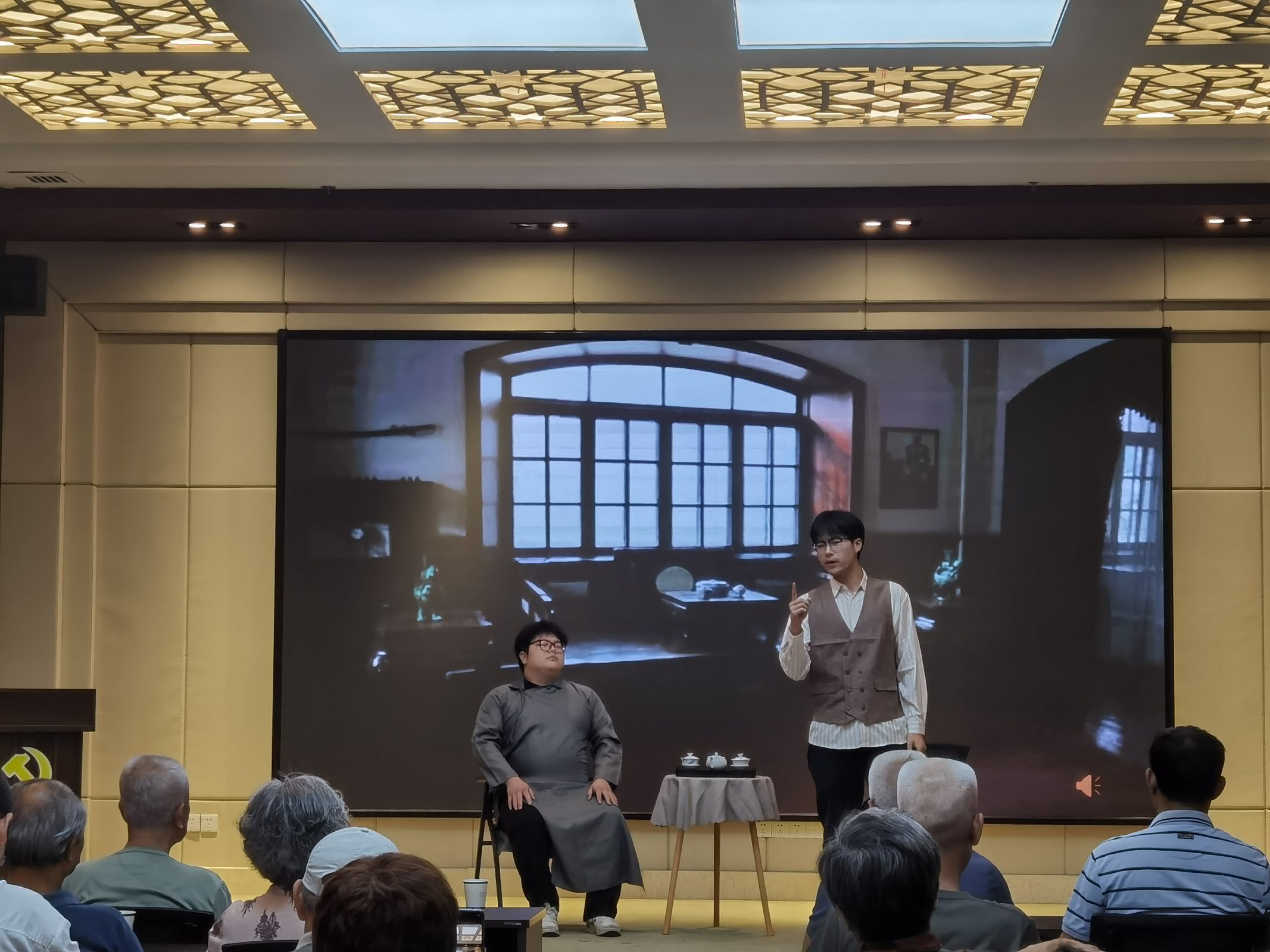 第三项,由​bevictor1946韦德官网带来的红色情景剧。片段选择的是1921年中共一大会议召开的历史事件,机电工程员工党员们生动再现了中共一大代表从上海法租界望志路106号转移到嘉兴南湖红船上开会的情景。情景剧中的共产党人,面对苦难,坚贞不屈,奋起抗争,以百折不挠的精神,谱写了一曲曲可歌可泣的宏大史诗,体现出一腔热血的共产党人的“忠魂”。当看见中共一大的会议因为法租界巡捕房的捣乱而被迫中断,有几位老同志攒起了拳头。情景剧表演结束后,一位老同志紧紧握着公司员工的手,真切地说:“我是经历了战乱的,那时候还小,也不知道什么,但是我们是确确实实饿过肚子的,也是确确实实过过苦日子的。孩子,你们的幸福来之不易,要好好长大,保家卫国。”