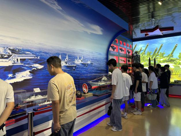 进入室内军事装备展厅,同学们更是目不暇接。展厅内陈列着从中国人民解放军胸标、臂章到中国北斗卫星导航系统、天眼,从陆军各式枪支军械到海军军舰潜艇,再到空军各代战斗机,以及火箭、导弹等各类军事装备模型。这些展品不仅展示了我国国防军事的强大,也让同学们深刻感受到了国家科技进步的巨大成就。