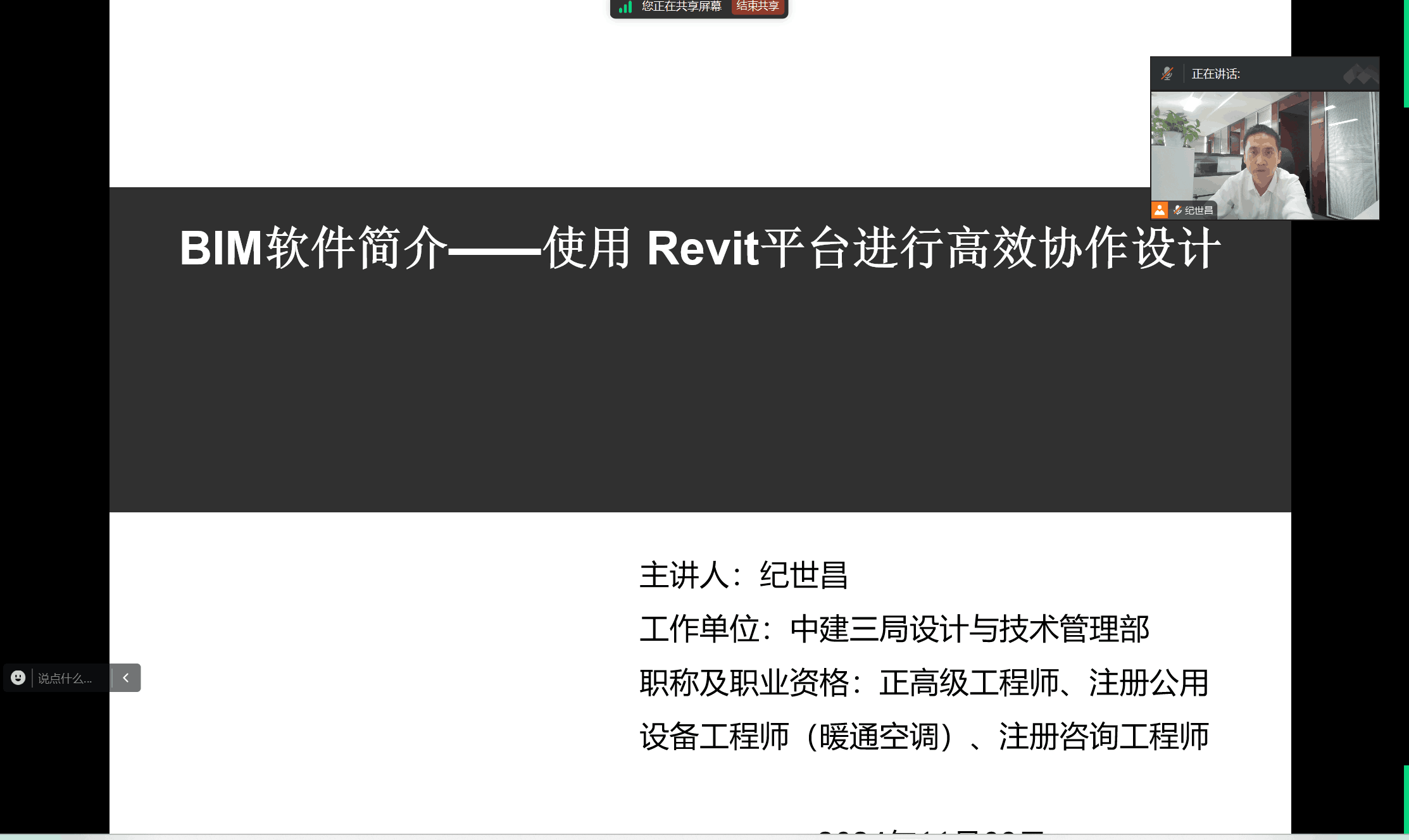 2024年11月09日上午9:00,公司荣幸邀请到中建三局工程设计有限公司正高级工程师纪世昌,为建环专业2025届全体毕业生及毕业设计指导老师举办了一场主题为“BIM技术在建环专业工程设计中的应用”的专题线上讲座。此次讲座由建环专业负责人胡云鹏老师主持,旨在提升员工在BIM技术方面的专业技能和实践能力。